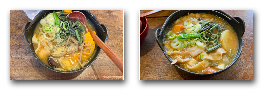 記憶通り、具材はゴロゴロと大きめのカットで、南瓜、じゃがいも、人参が特に存在感がある。他にも 山菜、いんげん、ネギ などがたっぷり入っていて、食べごたえは十分。